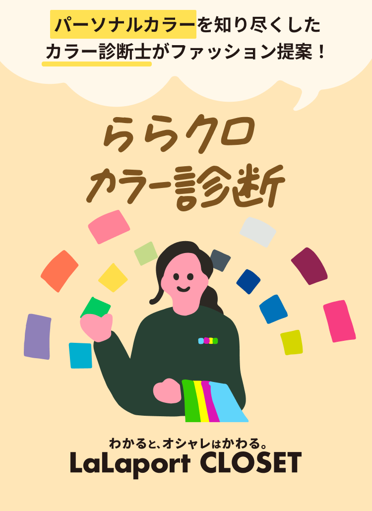 ファッションに精通したプロが120色のドレープであなたに本当に似合う色を丁寧に診断。さらにLaLaport CLOSETのアイテムから、色やスタイルにぴったりのコーディネートをご提案します。