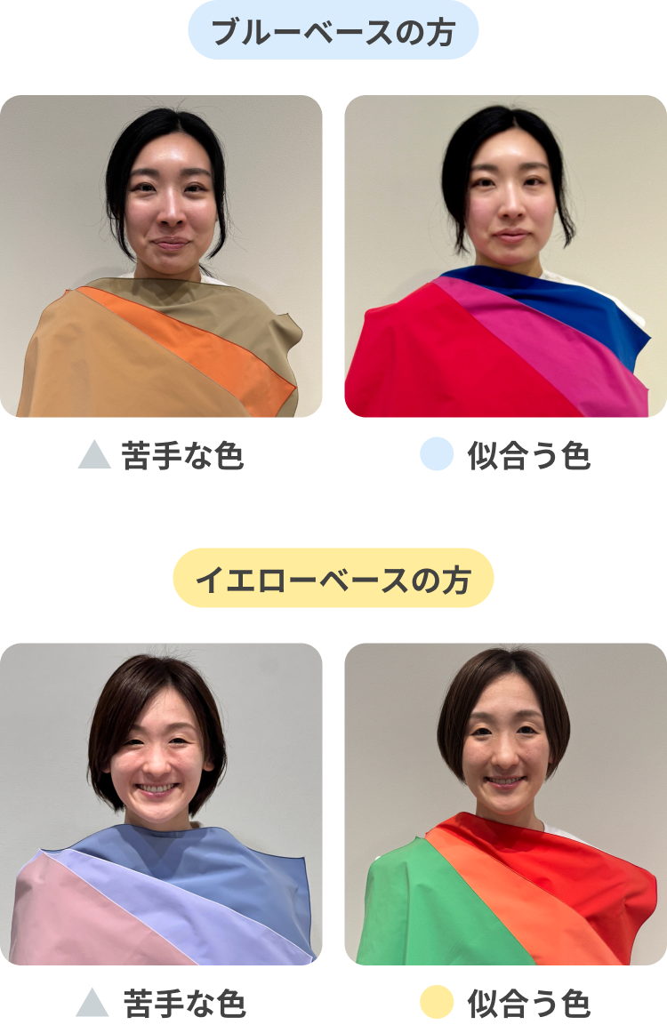 多数の色のドレープを使用して診断するため、似合う色と苦手な色の顔映りを実感できます。イエベ・ブルベだけでなくご自身に似合う色の傾向や、使い方なども診断中にアドバイスさせていただきます。